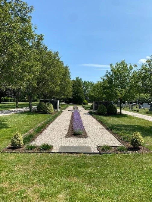 The peaceful Memorial Garden, the Cemetery’s newest section, lies just west of the Cemetery’s entrance road. It owes its existence to a generous donation made by Mrs. Virginia Campbell, to honor the memory of her husband, Dr. John Campbell. Those who choose cremation can purchase niches in the Garden’s columbaria. These are two large, black granite structures, with niches to hold cremated remains.